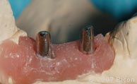 在有人工牙龈的石膏模型上,两个研磨基台装入红色塑料的种植体代型。 |